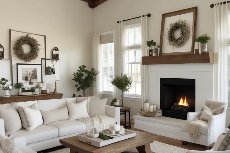 Shop farmhouse-inspired decor like distressed wood accents, neutral throw pillows, and vintage-style accessories to instantly add charm without a full remodel.